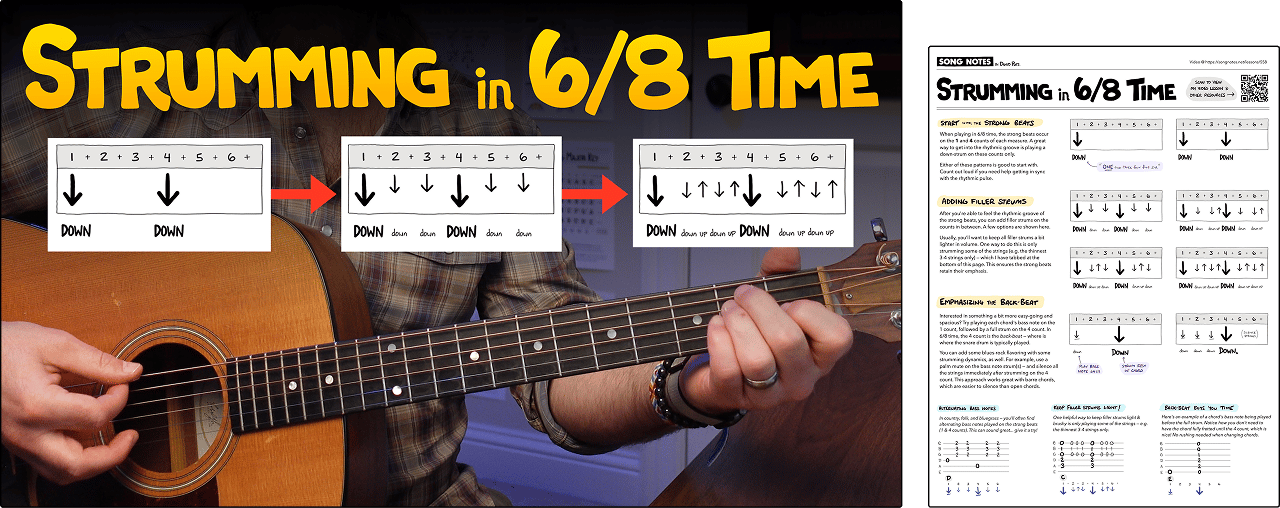 Hi there, Reader — hard to believe it, but I've reached my 600th weekly guitar lesson! Thanks to all of you who've been along with me on the journey so far. New lesson below... along with a roundup of my favorite songs in 6/8 time! LESSON #600 Click to watch free video lesson In this lesson I'll teach you to play Eddie Vedder's 2007 song Rise from the Into The Wild soundtrack. This song has remained one of my favorite songs of the 2000s — and I'm excited to share the various tips & tricks I've put together from many years of playing it. That allows us to use common chord shapes (D, G, A) - which enables us to play some reasonably approachable runs in the first 3 frets. As always, I'll start simple and build from there. Find all my lesson resources for this song over on my Song Notes website... including my practice guide, a "Part 2" lesson, and a few play-along practice videos. ONE two three FOUR five six This new tutorial, along with ~15% of the other songs I've taught, are played in 6/8 time. This means we'll have six counts per measure, which almost always means we'll be emphasizing the one and four counts. For a primer on 6/8 time, check out lesson #558: In addition to my strumming tutorial above, here's a collection of some of my favorite songs using this same time signature. Find a 6/8 strumming pattern you like, and you probably can use it playing any of these songs: Here's a few links if you want to jump straight to a certain song: