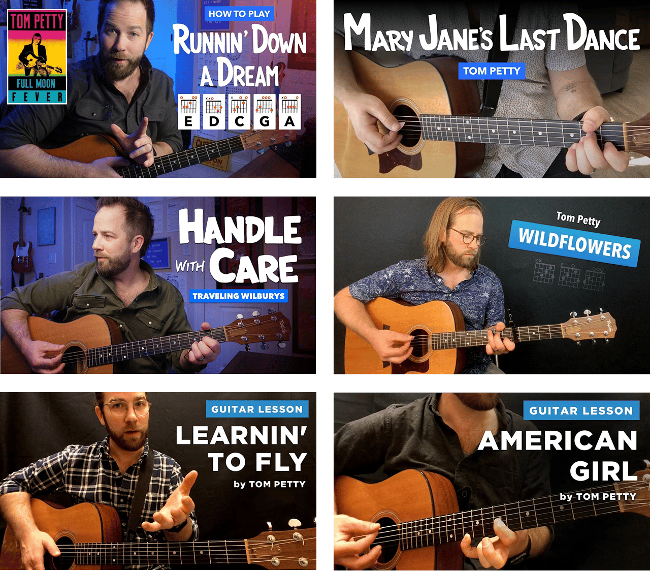 On the surface, this song may seem simple: just three chords and a repeating two-measure chord progression that’s used the entire time. But make no mistake, there’s plenty of ways you can level things up. I’ll walk you through the colorful chord voicings Tom Petty uses (in the Key of D and Key of E), as well as several strumming & rhythm tricks to make sure the repeating progression never gets stale. Visit my lesson webpage for all additional resources for this song. A looped practice track (you can hear me using it in my lesson), the lyric sheets I recommend, and my step-by-step practice guide, and more. Watch my Pyramid Strumming Drill Lesson » A few months back, I released this strumming & rhythm tutorial which is perfect for Free Fallin'... especially if you're looking for help with that tricky 16th note rhythm. Give it a watch if you haven't seen it yet! My Dad was a champ about letting me listen to whatever music I wanted, back when he was teaching me to drive. But the one CD I drove into the ground? Tom Petty's Greatest Hits. Once he asked me if we could (please) listen to something else, just to change it up. Fair enough. Anyhow, I'm a big Petty fan! Here's all the other songs I've taught, going back to 2017. Even in those thumbnails, it gives me a kick watch see my haircuts change over time.