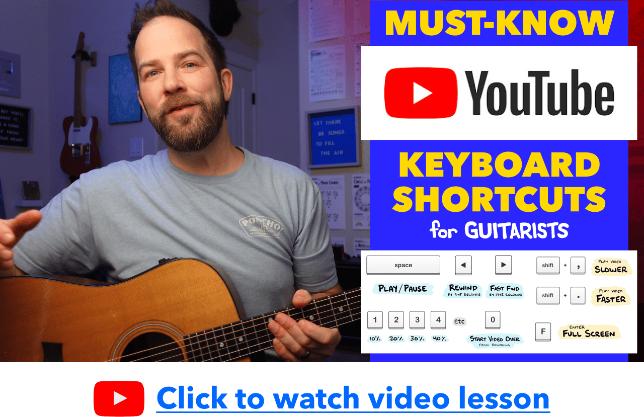 This adjusts the audio of her performance, lowering the key by 4 semitones / 4 half-steps / 4 frets. Again, this effectively removes her capo from the equation… which means you can play along without a capo, and be in the same key as her. This capo use-case has the admitted drawback of seriously compromising the vocal quality of her voice… but if you’re only worried about referencing the guitar parts, it does the job just fine. Another Must-Know Guitarist Tech Tip Let’s face it — a miracle of the modern age is the access we all have to video lessons, fan covers, or artist performances on YouTube — each of which makes our learning journey so much faster. As great as this is, there’s the awkward dance of moving our hands from guitar to our computer mouse so we can use the cursor to click and rewind, pause, fast forward, or otherwise adjust the video that’s playing. Trust me when I say there is a better way. I’m talking about keyboard shortcuts. By learning just a few, you’ll be able to control playback in a small fraction of the time it takes to use your mouse & cursor. This removes frustration, increases the time we’re actually playing the guitar, and gets us where we want to go that much further. So let’s dive in!
