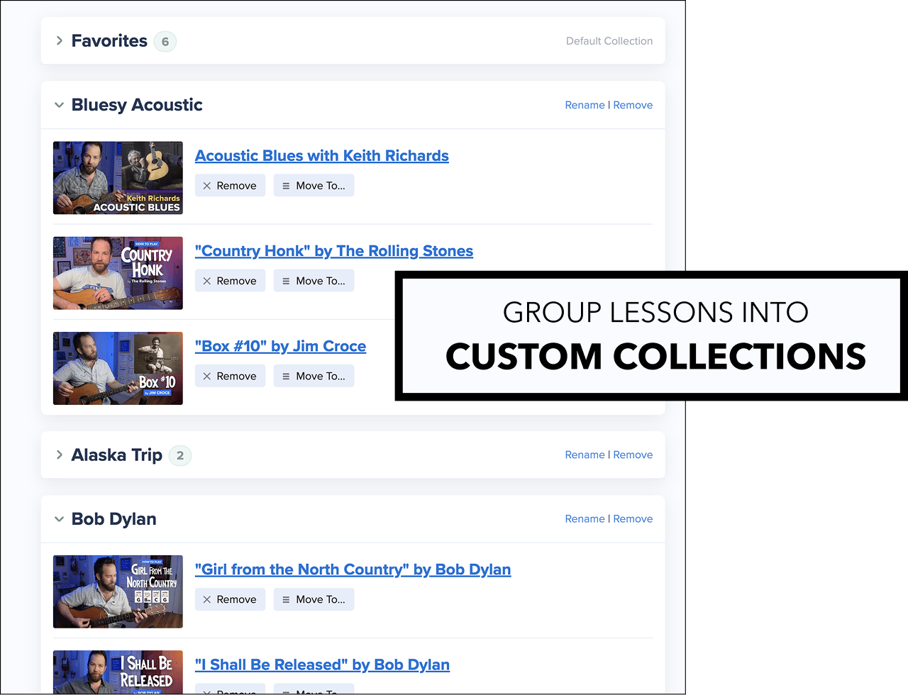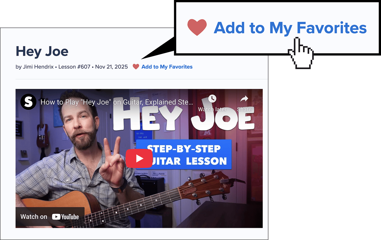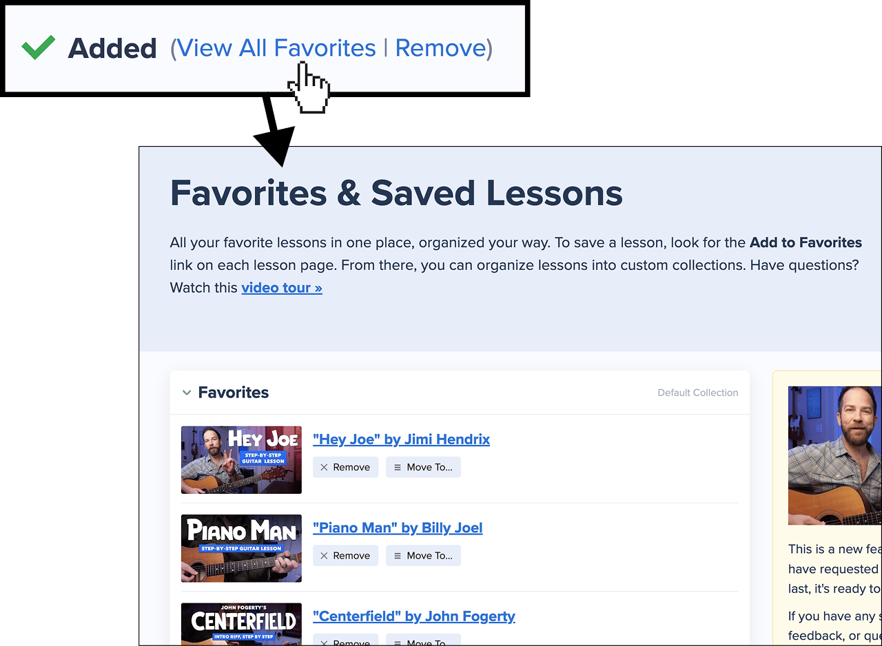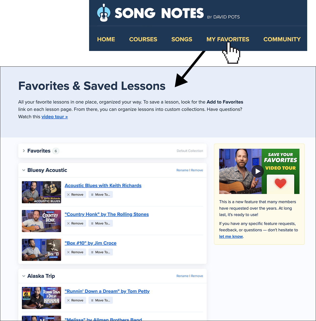 YOU ASKED, I LISTENED! ​Click to view "My Favorites"​ At long last! You can finally save & organize your favorite lessons over on my Song Notes website. This is a feature that's been regularly requested by members over the years, and I'm pumped to announce it's ready! HOW IT WORKS From any lesson page, click the Add to My Favorites link. For your convenience, it's always positioned just below the lesson title. That will immediately add it to your Favorites list. You can keep on learning the song — but if you wish, I added a handy link to take you directly to your favorites page: And from there, you are free to organize your favorites into custom collections. Use as many (or few) as you wish! Rename them, reorder them, or delete them if you got a bit too click-happy (it happens). It's as simple as that! I've also added a My Favorites link into the main navigation bar – so from any page, it's all one click away: GO HAVE SOME FUN! Try it for yourself at https://songnotes.net/favorites​ This feature is available to members of Song Notes Premium. To view all other membership benefits, see my video tour. A FEW MORE NOTES I realize this isn't a world-changing feature. Bookmarks in your browser will do the job. Tons of other guitar sites have this same feature. All that is true, obviously. Just the same: my songnotes.net website is a passion-project of mine, where I've posted over 600+ weekly-ish lessons, along with nearly 100 course videos over the past decade. I plan on keeping at it as long as I can. Features like this are incredibly important when it comes to ensuring my website is properly expanding in its feature-set, especially as my library grows. THANKS TO ALL WHO REQUESTED THIS Special thanks to all the members on my Song Notes website... especially to the many of you who requested this feature over the last few years. I truly hope this makes your guitar-playing time more productive. It took me a while, but I finally got it done. If you have feedback, let me know! I'll no doubt expand & improve this feature over time. But you have to start somewhere, and I'm proud of this as a first version. Thanks, as always — and enjoy! David |