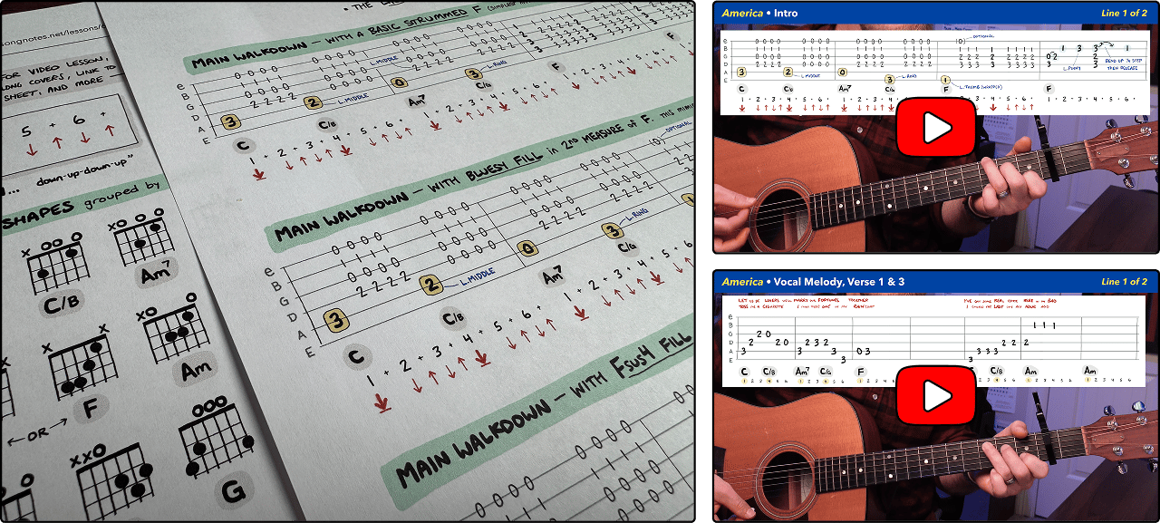 Don't miss all my additional practice materials for this lesson β step by step notes, a vocal melody deep-dive, a zoomed playthrough, a link to a recommended lyric sheet, and more. Get all this on my America lesson page Β»β Techniques Used in This Song For additional help with the tips & techniques used in this song, here's a quick list of the tutorials to help you along the way:
