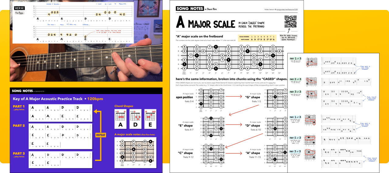 In addition to my main video lesson above, I made a few bonus items to help you have fun with things. This includes a zoomed-in playthrough, a video practice track, and a print-friendly guide showing all the A major scale shapes on the fretboard (and a few extra example phrases tabbed out).