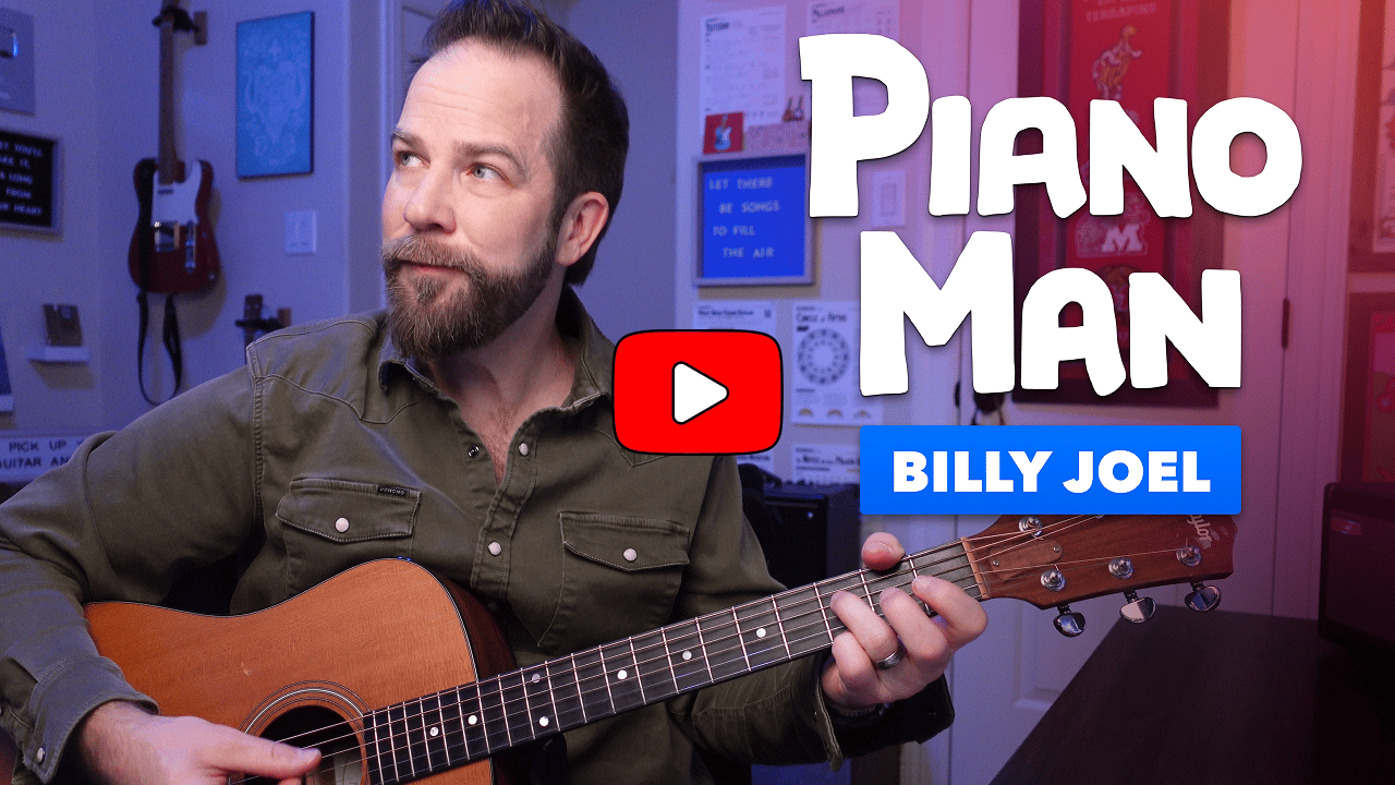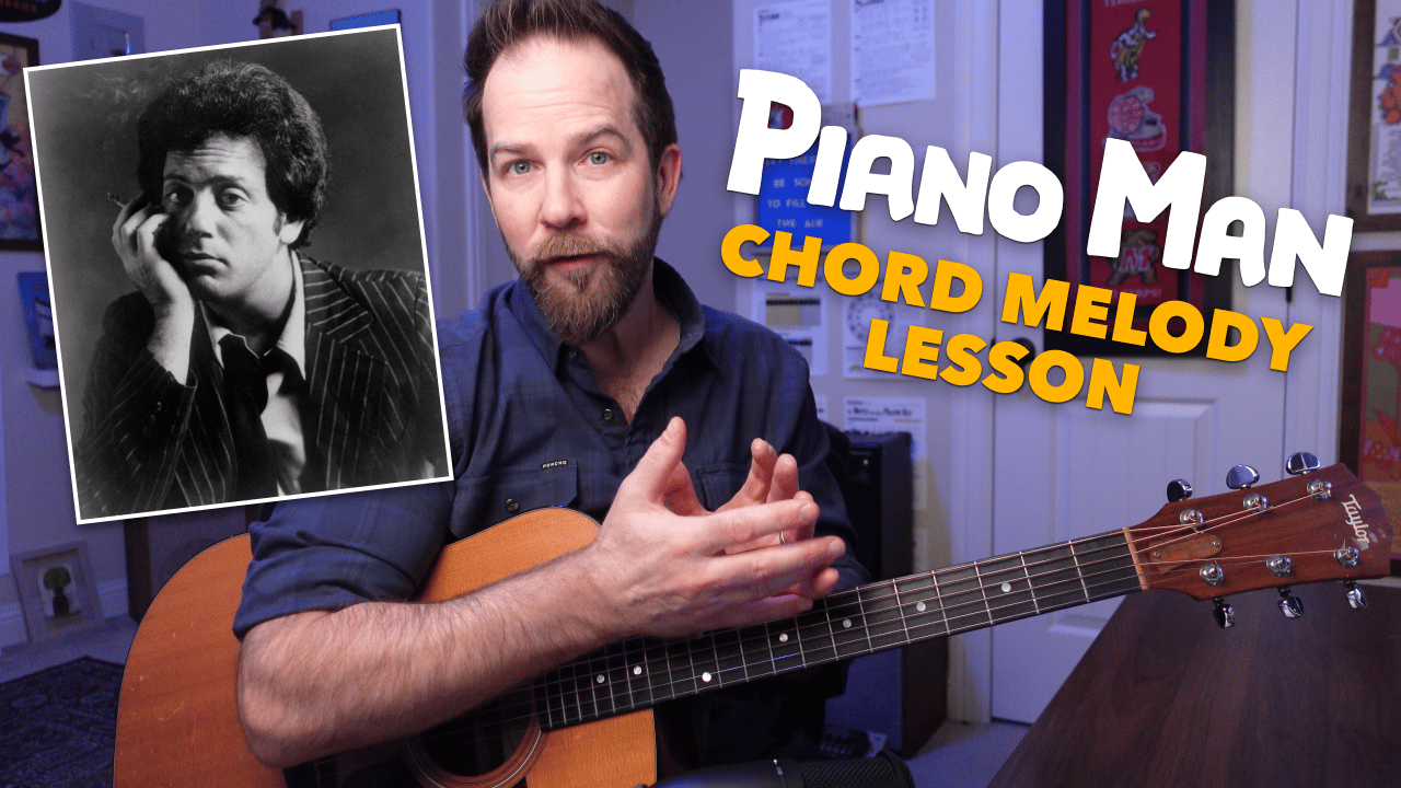 LESSON #612Melodic Fingerstyle Fun with "Piano Man" Click to watch free video lesson In this lesson I’ll teach you to play a melodic fingerstyle arrangement inspired by Piano Man by Billy Joel. Specifically, I show how we can play the main melody of the song (heard in the verse and chorus) and play it along with a few other notes from each chord that’s used. The result is melodic, but also harmonically rich — and is a blast to play! In addition to my main video (above), don't miss the "Part...